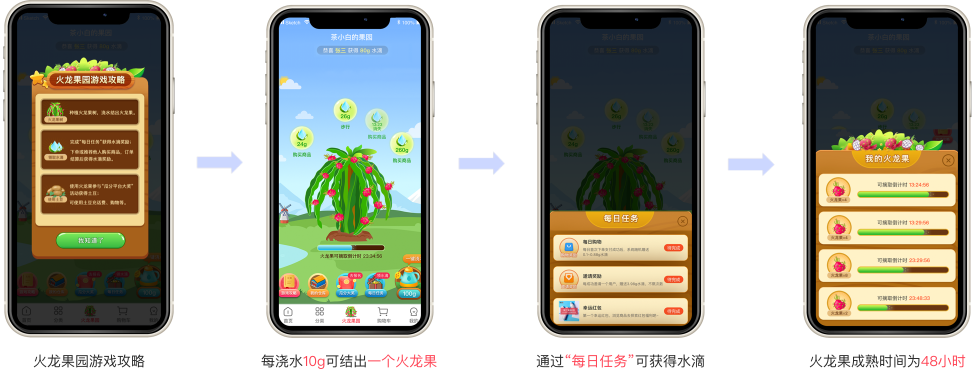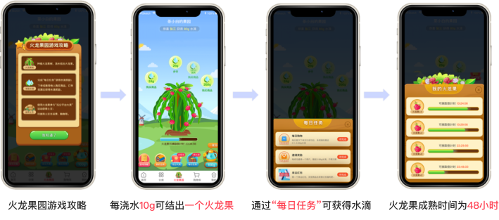 火龙果园是一个游戏园区,用户通过给火龙果树浇水获得火龙果,火龙果可参与“瓜分平台大奖”。