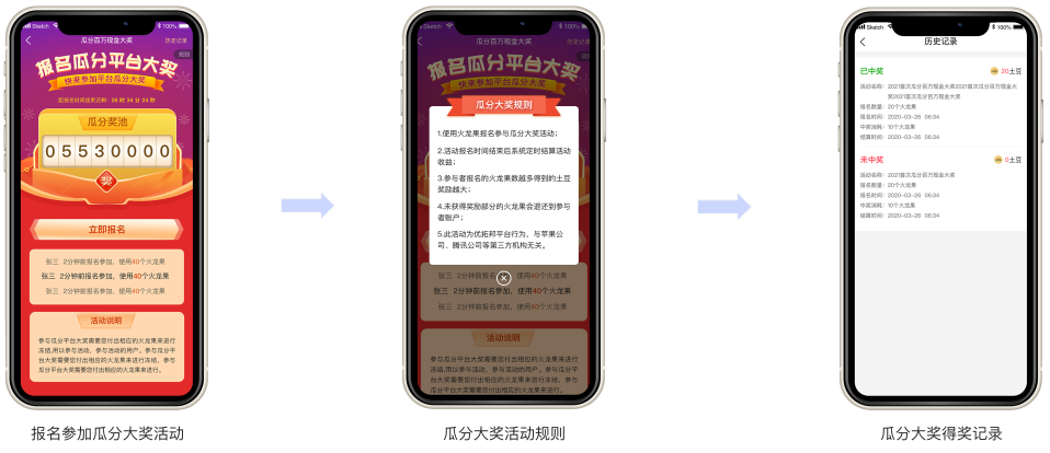 用户通过火龙果园获得的火龙果可参与“瓜分平台大奖”,获得的奖金以“土豆”形式发放。报名参与的火龙果个数越多, 获得的奖励越大。可以使用“土豆”充值话费、购买商品等。